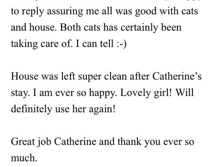 Experienced cat and dog sitter who has sat pets and minded homes both in UK and Australia. Also have experience with small animals e.g. rabbits and guinea pigs. Caring, trustworthy, clean and tidy animal lover.
