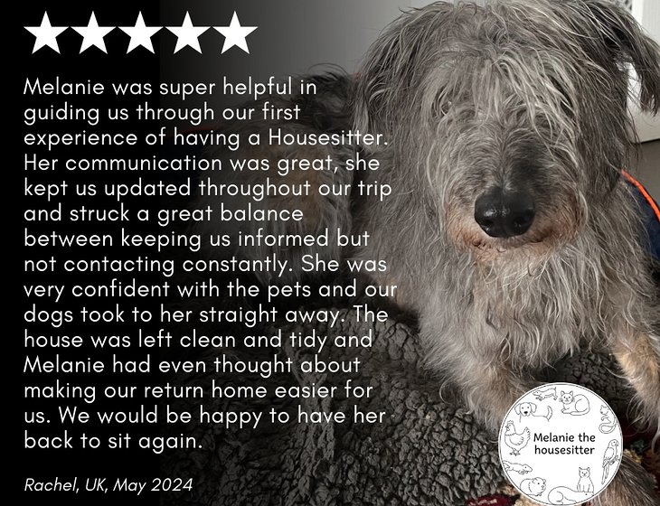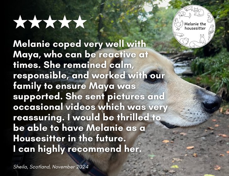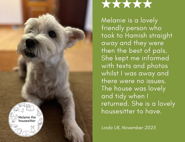I’m an experienced house and pet sitter with over two years of hands-on sits across the UK, supported by extensive references and consistent 5-star reviews. Although I’m Canadian, I spend a significant amount of time in the UK and regularly house sit across Scotland and England.