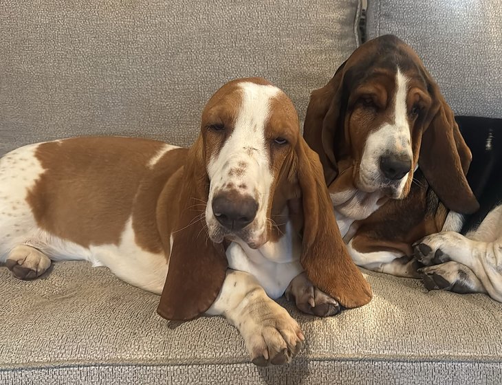 We are located in a small village Bighton close to Alresford. We live on a farm, our house is located next to the farm buildings. We have Ralph 4.5yrs and Roux 10months who are uncle and niece Bassett Hounds. Ralph is very laid back, Roux still young but calming (very loving) and is fully house trained. They require one walk a day and fed twice a day. We have lots of fields and walks outside the front door and a pub just down the road!