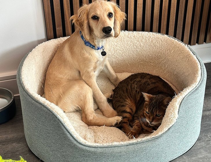 We have a 6 month old cocker spaniel and a 10 year old Bengal cat.