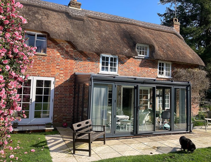 We are Sue and John Russell and we live in a detached thatch cottage on The Common in Woodgreen, in The New Forest. Ponies, donkeys and cows wander freely and come right up to our hedges. The garden at the back is very private. There are lovely views across The Common towards Breamore House.