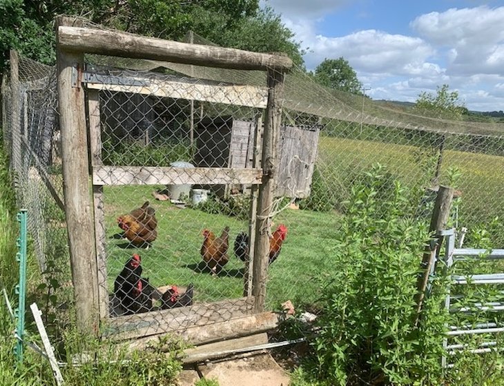 We have a friendly seven year old collie and a few chickens who live within a chicken run in an adjacent field. They do not require shutting up at night as they live in a secure run.