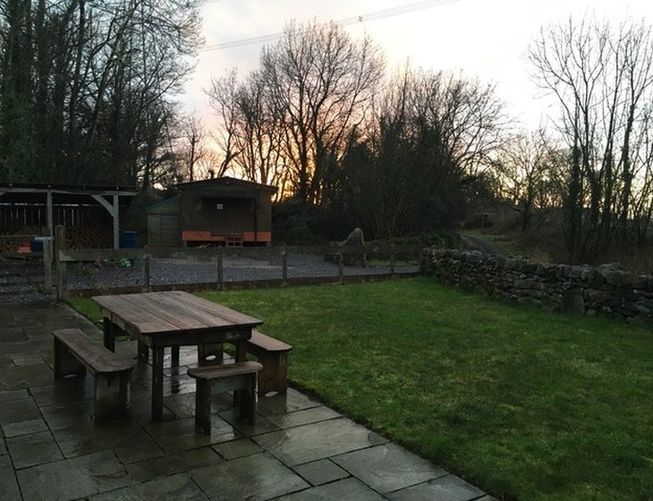 Outside there is a fenced garden with a rustic dining table and benches lovely in the summer.