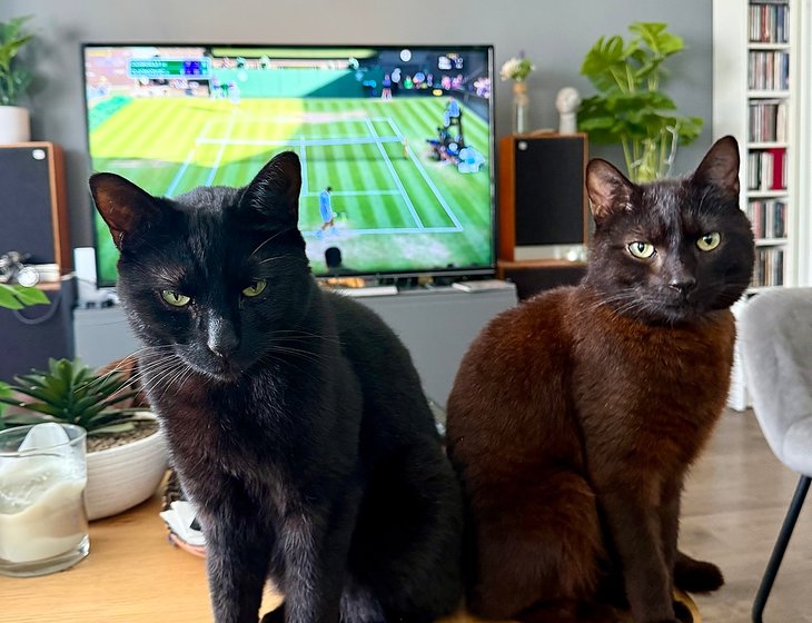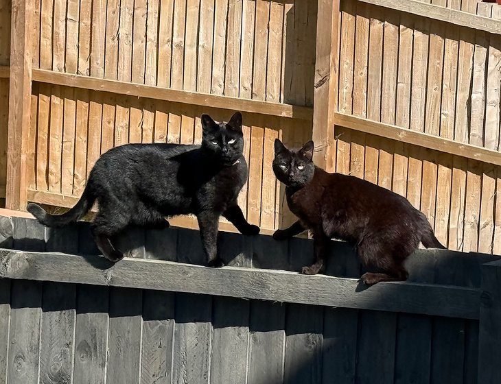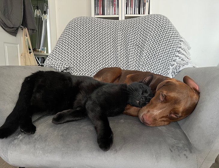- We have two cats, Ollie and Huey, and a bouncy four year old dog called Tiggy. The cats are very relaxed and access the garden via the kitchen window. Ideally they'd be inside at night-time and there is a litter tray in the kitchen for them. Huey loves a cuddle on the sofa (Tiggy isn't allowed on the sofa unless she's on a lap).
