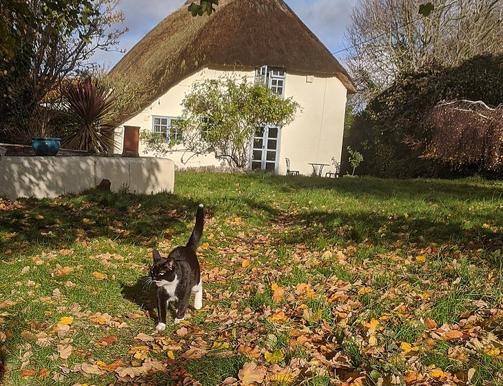 We live in a thatched cottage on the outskirts of a hamlet, a bit over a mile from the sea and at the foot of Exmoor.