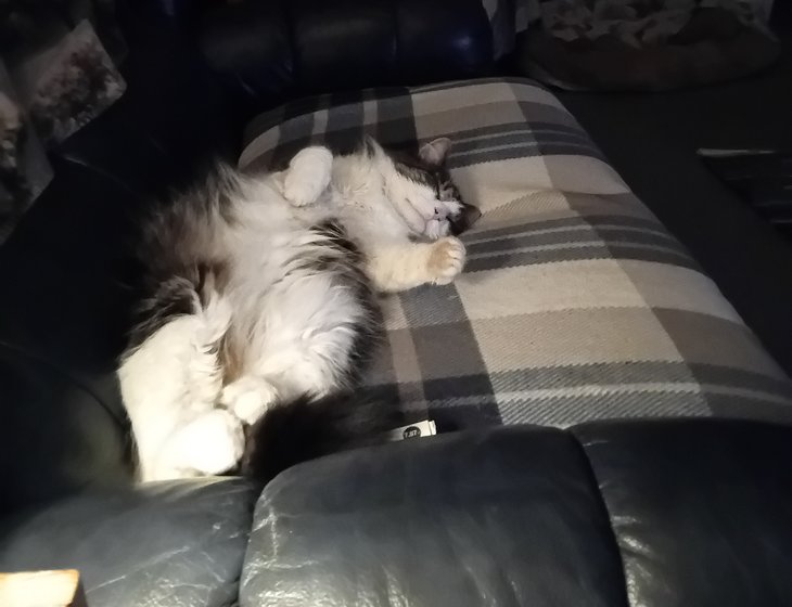 Jim is a rescue cat, came to me last November. He's very shy, though now he knows me, I am his seat and his slave. He's enormous, and vet thinks about 4 yrs old