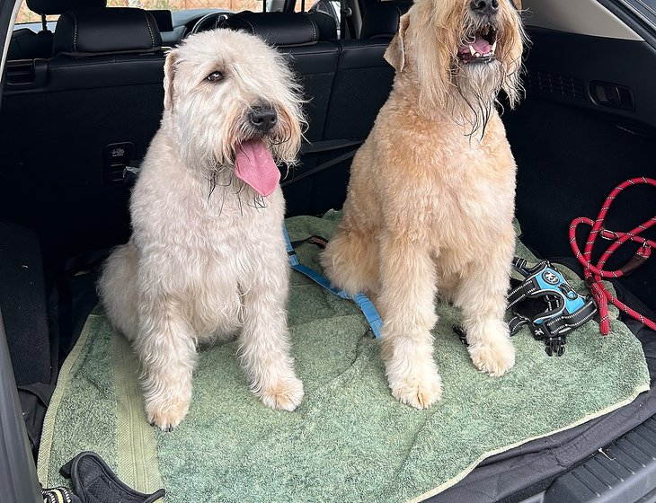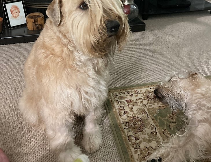 Our pets are 2 lively Soft Coated Wheaten Terriers named Ted and Wilma. Ted is nearly 8 years old, a 20kg male. Wilma is Ted’s niece and is nearly 5yo, 17kg. They are used to 2 walks of 20 minutes per day around Derrington – they’ll need to be walked separately which is why we think sitters that are a couple would be preferable.
